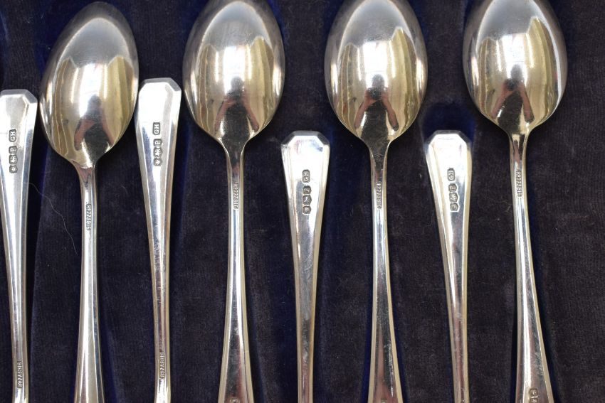 Cased set of twelve Art Deco hallmarked silver teaspoons, Sheffield 1932, maker Harrison Brothers & Howson, weight 176g