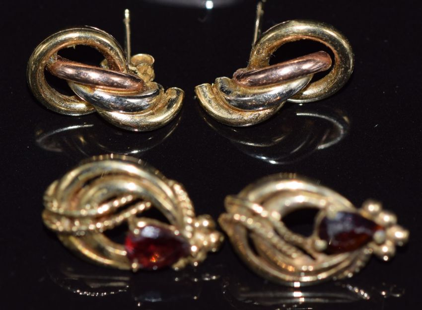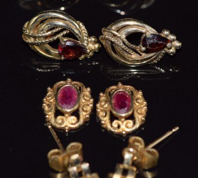 Three pairs of 9ct gold earrings, two sections of earrings set with a ruby to each (5.3g), and an 18ct white gold earring (1.2g)