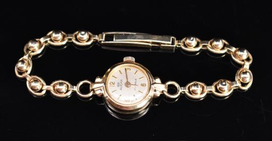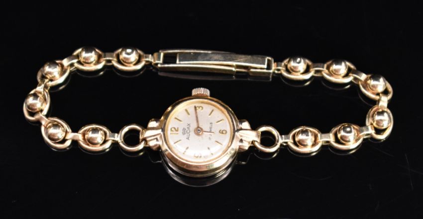 Audax 9ct gold ladies wristwatch with gold hands and hour markers, silver dial and mechanical movement, on 9ct gold ball link bracelet, case diameter 16mm, 11.9g.