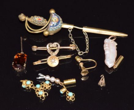 Two 9ct gold brooches, micro mosaic pin, loose seed pearls, loose turquoise links, pearl pendant, etc