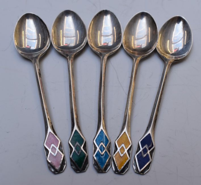 Five Liberty & Co Art Deco hallmarked silver and guilloché enamel teaspoons, Birmingham 1934, length 9.5cm, weight 33g