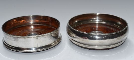 Two hallmarked silver wine coasters, one with feature hallmarks, diameter of largest 14cm