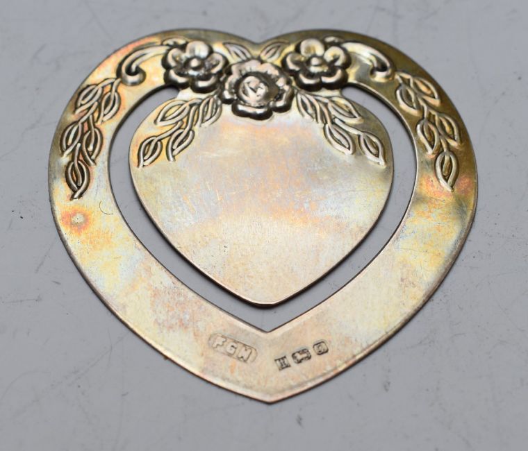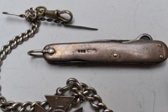 Hallmarked silver, white metal and other collectables including Victorian Sherry bottle ticket, Birmingham 1838, heart shaped money clip / bookmark, two hallmarked penknives, Edward VII hallmarked silver cylindrical vesta, Birmingham 1902, maker Cohen and Charles, plated heart shaped vesta with silver chain and fob, hallmarked silver fob with yellow metal and enamel decoration for Derbyshire Football Association, Southern Division cup runners up 1909-10 and a 9ct gold clip for a watch chain, 2.5g
