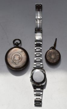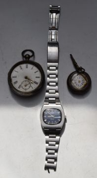 A hallmarked silver open faced pocket watch together with a Rotary gentleman's automatic wristwatch ref. 62.89.77 and a .935 silver fob watch.