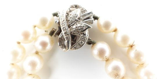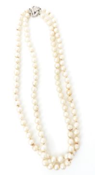 A collection of pearl necklaces including a double strand with 14k white gold clasp set with diamonds
