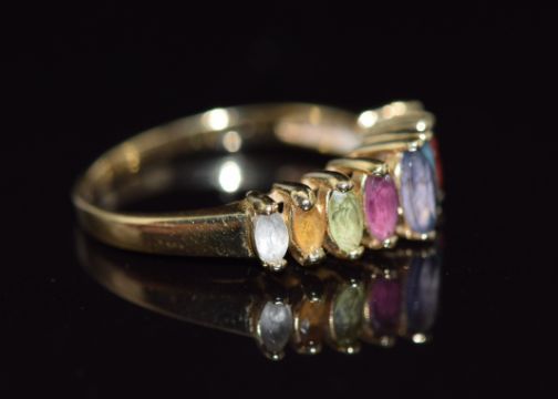 A 9ct gold ring set with marquise cut topaz, garnet, peridot, amethyst & citrine, 2.5g, size N