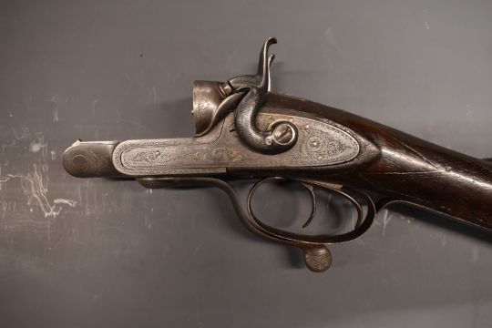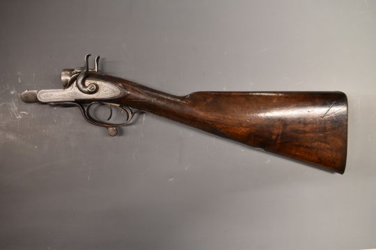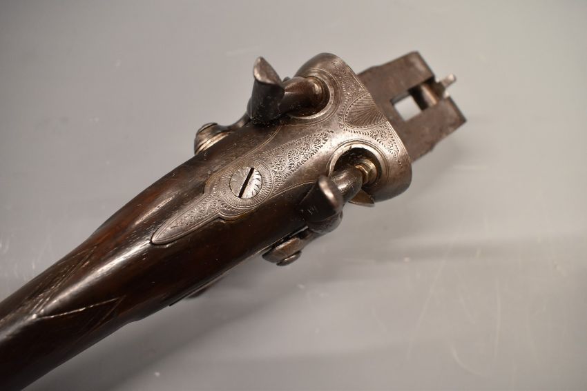 J V  Needham 12 bore side by side hammer action shotgun stock and action with named and engraved locks, engraved hammers, rotary underlever, underside, fences and top plate, chequered grip and vacant cartouche to the underside of the stock, overall length 50cm, serial number 1822.  PLEASE NOTE THAT A VALID RELEVANT FIREARMS/SHOTGUN CERTIFICATE IS REQUIRED TO HANDLE/PURCHASE THIS ITEM.