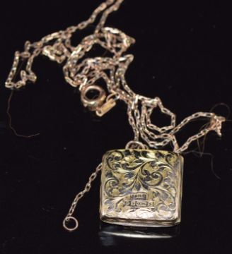 Edwardian 9ct gold locket, Birmingham 1906, with engraved foliate decoration and an 9ct gold chain, 5.2g
