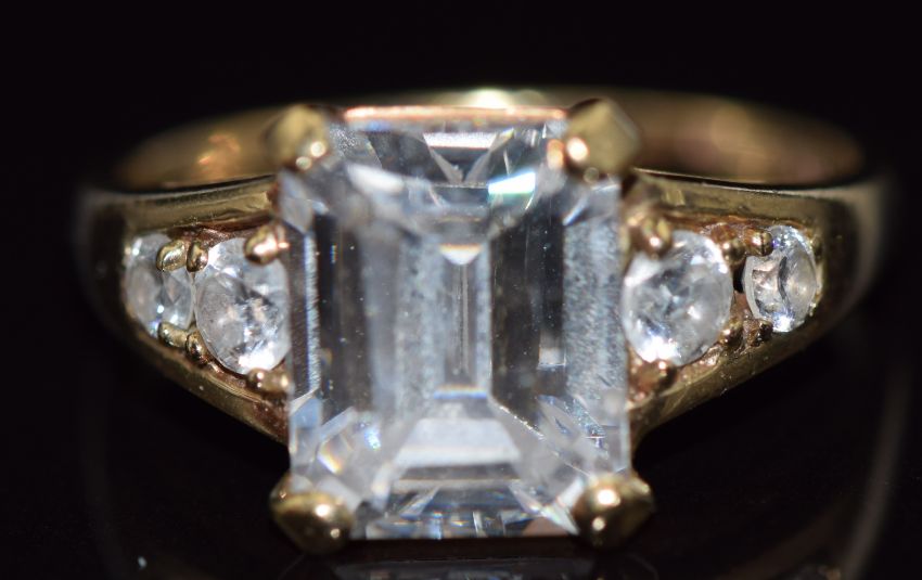 A 9ct gold ring set with an emerald cut cubic zirconia and further round cut cubic zirconia to the shoulders, 4.4g, size O