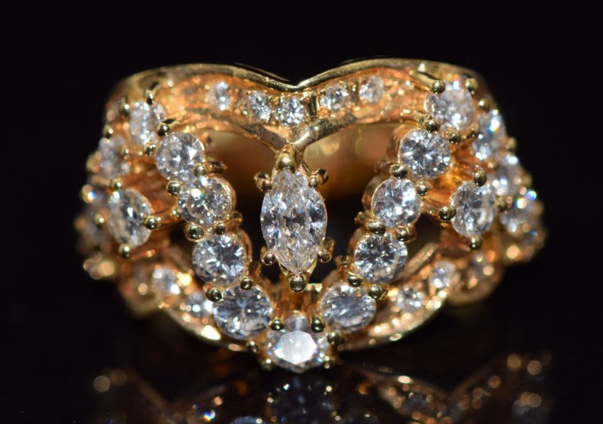 An 18ct gold ring set with a marquise cut diamond and round cut diamonds, size M, 10g