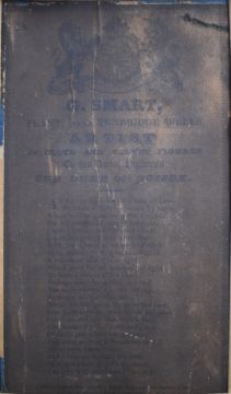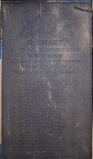 19thC felt appliqué and watercolour collage picture, probably by G Smart, depicting Mr Bright, Tunbridge Wells Letter Man, with Wells 2 mile post and 'Smart Repository' to end gable of building. Label verso with coat of arms and 'G Smart, Frant, near Tunbridge Wells, artist in cloth and velvet figures to his Royal Highness The Duke of Sussex', 22 x 26.5cm