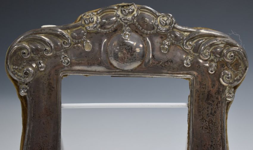 Art Nouveau hallmarked silver photograph frame, to suit 6x4 inch photo, Chester 1909, maker W J Myatt & Co, together with an Edward VII hallmarked silver perpetual calendar, Birmingham 1903 maker William Henry Sparrow, height 9cm
