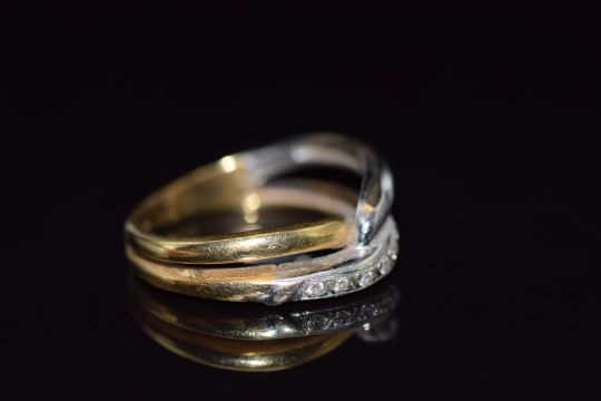 A 9ct bi-coloured gold ring set with diamonds in a twist setting, 3.9g, size K