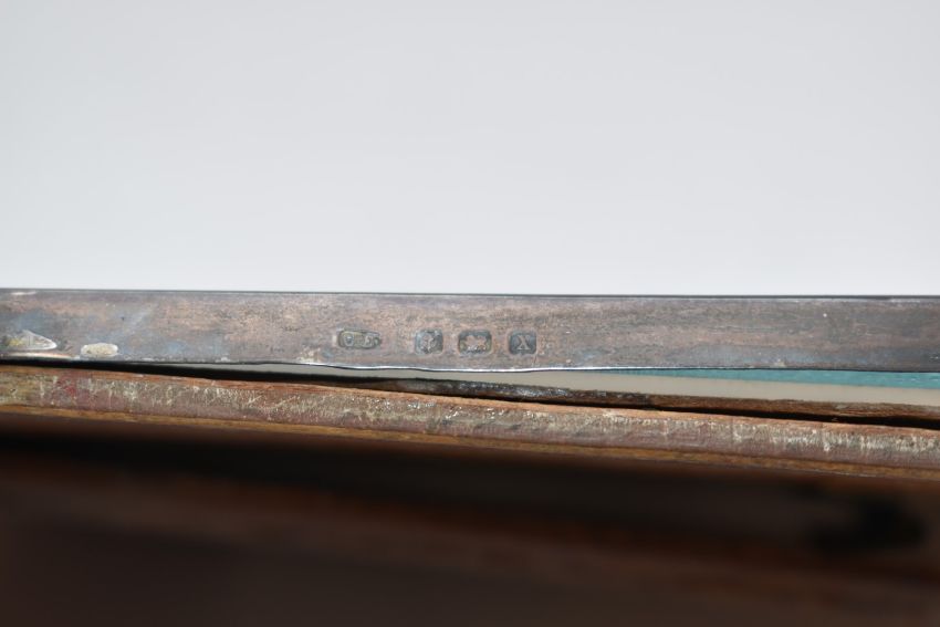 Pair of hallmarked silver photograph frames to suit 7x5 inch photographs together with a similar smaller example, all with wooden easel backs
