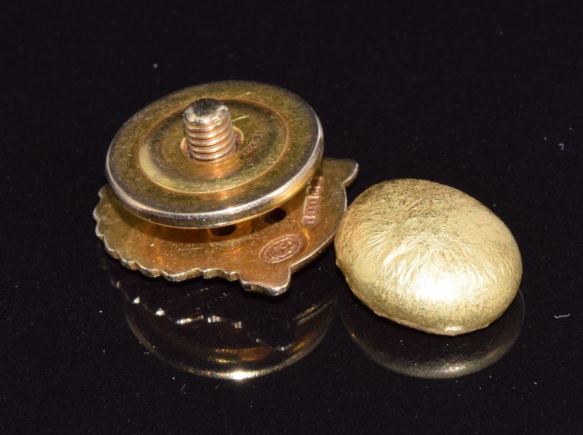 A 9ct gold 35 years service shell badge (3.4g) and a gold nugget (4.8g)