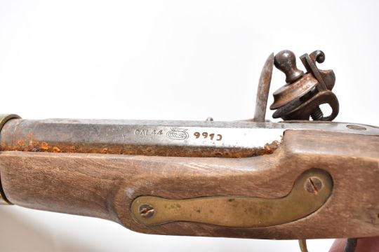 Brander .44 flintlock hammer action coastguard's or constabulary style pistol with named lock, brass trigger guard, butt plate and mounts, brass tipped steel ram-rod and 9 inch smooth bored barrel, overall length 38cm, serial number 9910. PLEASE NOTE THAT A VALID RELEVANT FIREARMS/SHOTGUN CERTIFICATE IS REQUIRED TO HANDLE/PURCHASE THIS ITEM.