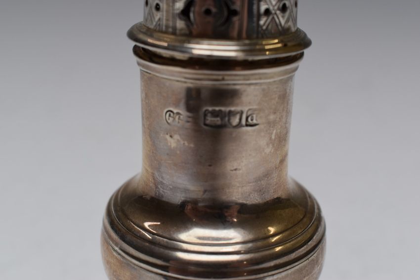 Cased Walker & Hall George V hallmarked silver cruet set comprising two peppers, two salts, two mustards and four spoons, larger pieces Birmingham 1932, spoons Sheffield 1932, width of case 22cm