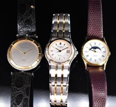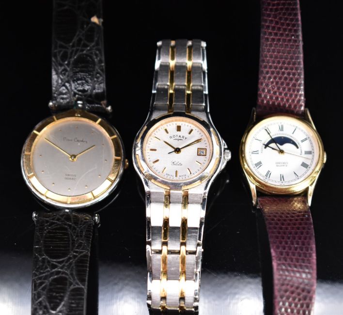 Three ladies wristwatches Seiko 2A24-0040 with moonphase, Pierre Cardin and Rotary Elite, all with quartz movements, largest case diameter 30mm.
