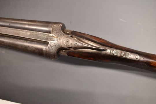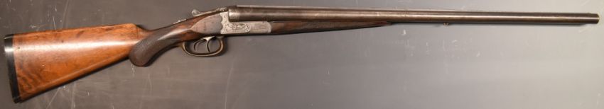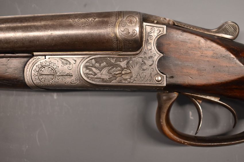 Hubertus of Suhl Germany 12 bore side by side ejector shotgun with heavily engraved scenes of birds to the locks, engraved underside, fences, top plate and thumb lever, carved horn trigger guard, chequered semi-pistol grip and forend, double trigger and 26.75 inch barrels, overall length 110cm, length of pull 37cm, serial number 58388.  PLEASE NOTE THAT A VALID RELEVANT FIREARMS/SHOTGUN CERTIFICATE IS REQUIRED TO HANDLE/PURCHASE THIS ITEM.