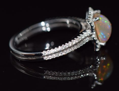 An 18ct white gold ring set with an Australian opal surrounded by diamonds and with further diamonds to the shoulders, 3.6g, size L