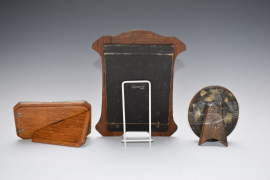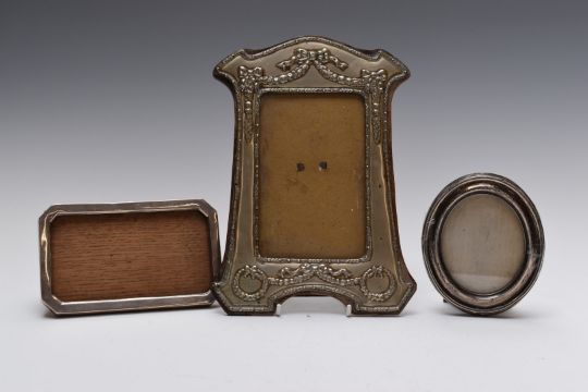 George V Art Deco hallmarked silver photograph frame, to suit 5x3 inch photo, with oak easel back to suit portrait or landscape use, Birmingham 1924, maker Charles S Green & Co Ltd, together with an oval hallmarked silver photograph frame with easel back, height 11cm and a plated photograph frame, height 22cm