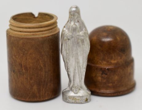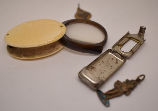 An ivory loupe, religious pendant, St Christopher, turned wooden pot opening to reveal a religious miniature statue and a silver medallion depicting Bremen Cathedral