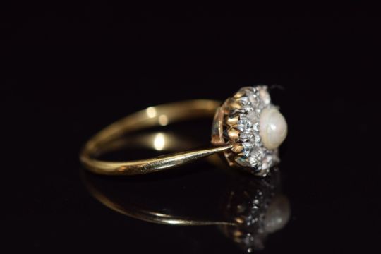 Victorian ring set with a natural pearl surrounded by old cut diamonds, size R, 3.3g