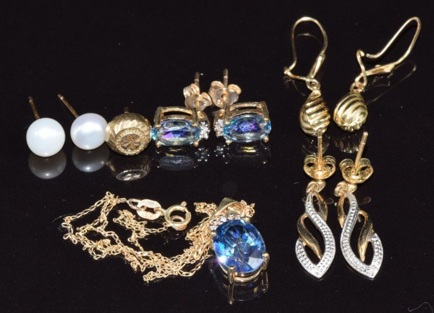 A 9ct gold necklace and earrings set with mystic topaz, three pairs of 9ct gold earrings and a pair of pearl earrings,6.8g