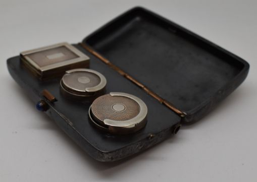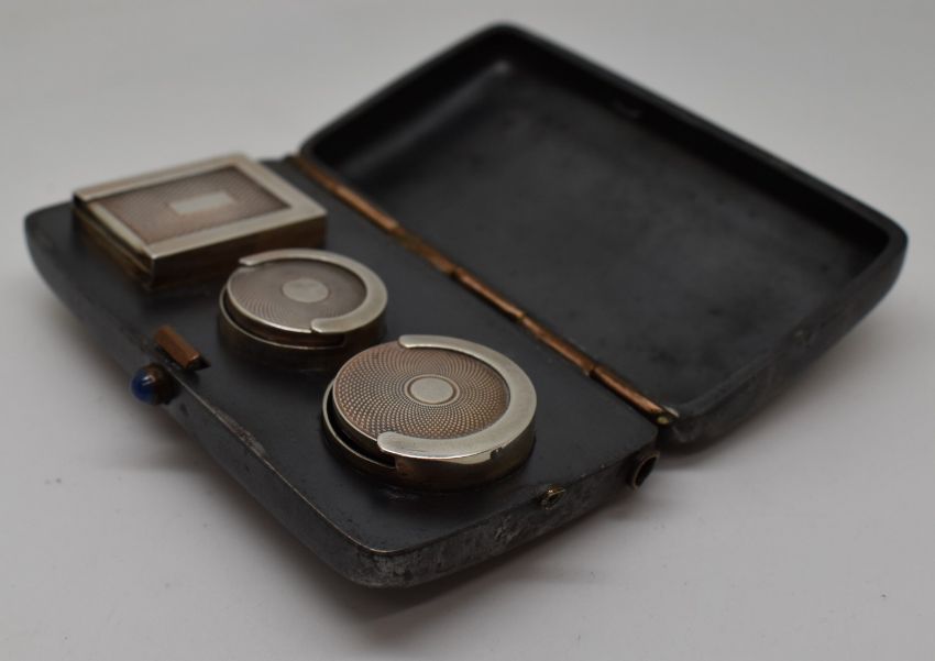 Victorian or early 20thC combined stamp and sovereign case, with blued steel or gunmetal case, the catch set with a blue cabochon, L8.5cm