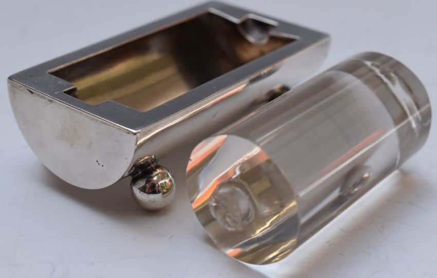 George V hallmarked silver and glass stamp roller or wetter, having glass roller, the barrel shaped body raised on four ball feet Chester 1912, maker Stokes & Ireland Ltd, also marked Finnigan, length 7cm