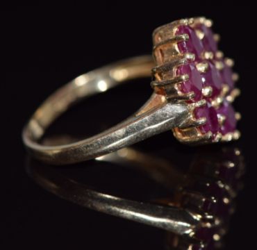 A 9ct gold ring set with round cut rubies in a cluster, 4.7g, size O