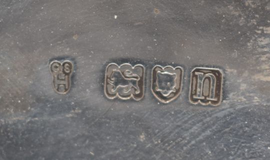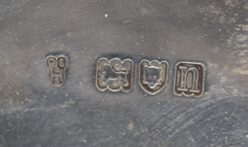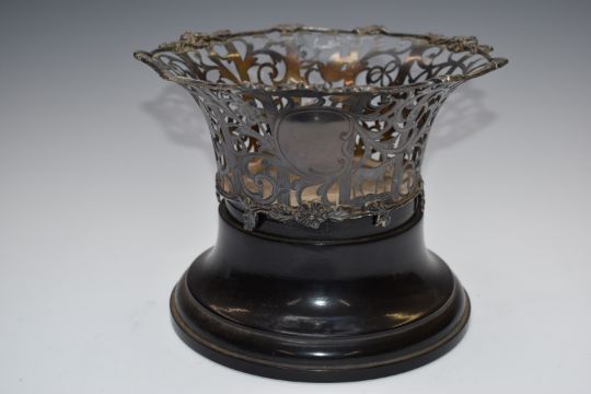 Edward VII hallmarked silver pierced basket with decoration of birds and horses, London 1908, maker C S Harris & Sons Ltd, diameter 21.5cm, weight 445g, on ebonised turned wood base, overall height including basket 17cm