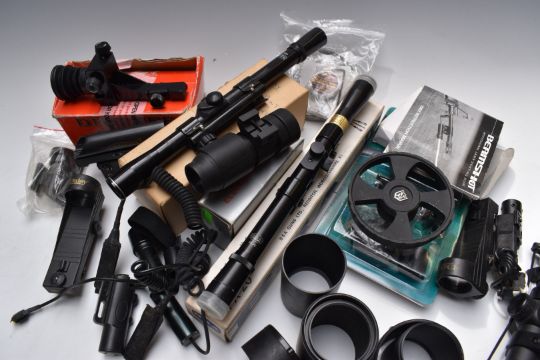 A collection of air rifle scopes and accessories including red dot laser sights, Hawke Sport Dot, SMK 4x32, BSA Mark IV, side wheels, single point rifle sight, covers, caps, lenses etc, some unused in original boxes.
