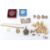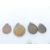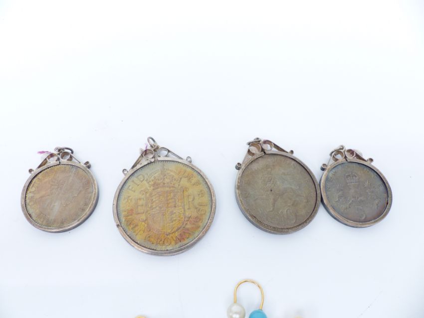 Four silver charms, a collection of floral links, four silver mounted coins, religious pendant, silver card holder, etc