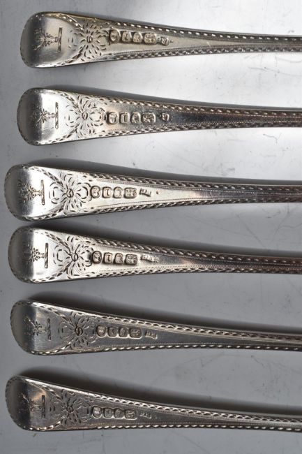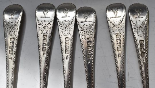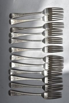 Set of twelve Georgian hallmarked silver table forks, with bright cut decoration, London 1786, maker Richard Crossley, length 20cm, weight 903g