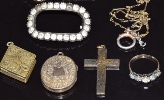 A silver brooch set with paste, two paste brooches, locket, cross pendant, and 9ct gold ring set with paste