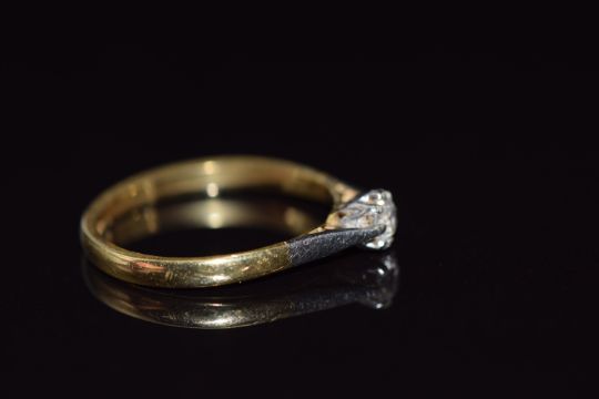 An 18ct gold ring set with a round cut diamond of approximately 0.2ct, 3g, size P/Q