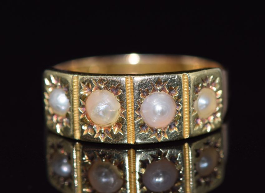 Edwardian 15ct gold ring set with four split pearls, Birmingham 1901, 3.4g, size N