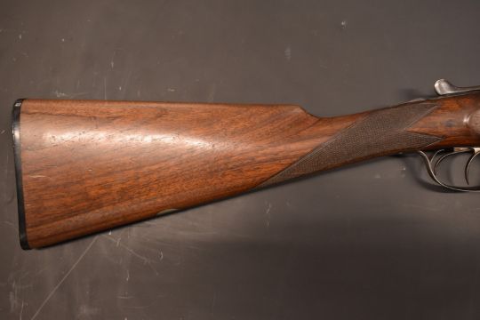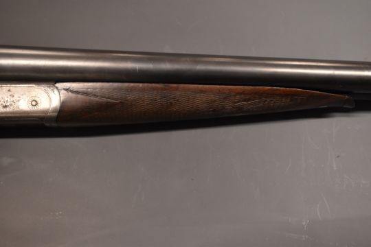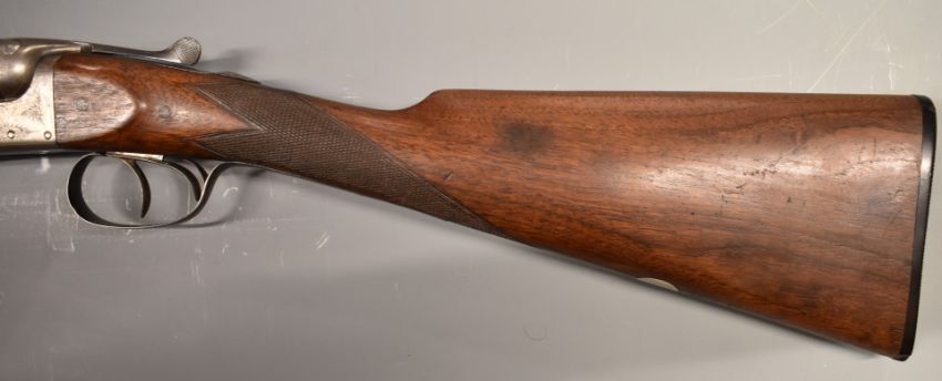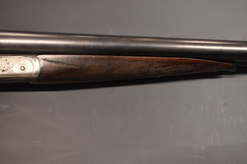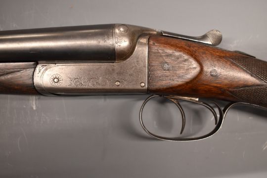 George Gibbs 12 bore side by side shotgun with scrolling engraving to the locks, trigger guard, underside, fences, top plate and thumb lever, chequered grip and horn tipped forend, vacant cartouche to the underside of the stock, double trigger and 29 inch barrels ½ and unchoked and engraved 'Manufactured for George Gibbs 39 Corn Street Bristol', overall length 115cm, length of pull 36cm, serial number B3883.  PLEASE NOTE THAT A VALID RELEVANT FIREARMS/SHOTGUN CERTIFICATE IS REQUIRED TO HANDLE/PURCHASE THIS ITEM.