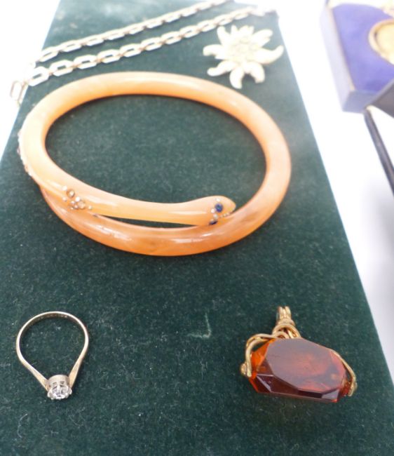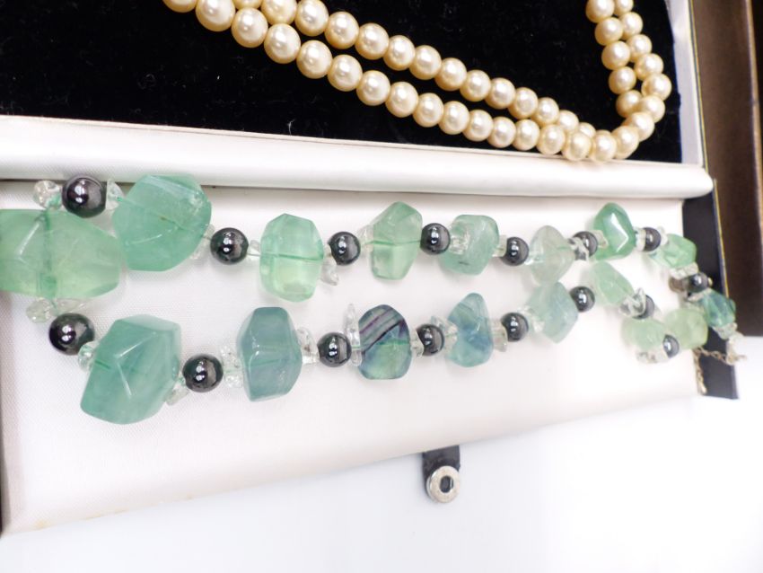 A collection of costume jewellery including two silver brooches, Art Deco snake bangle, necklaces including fluorite etc