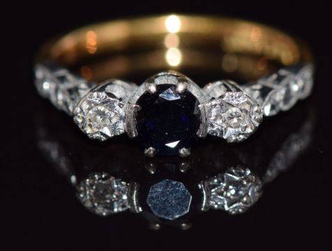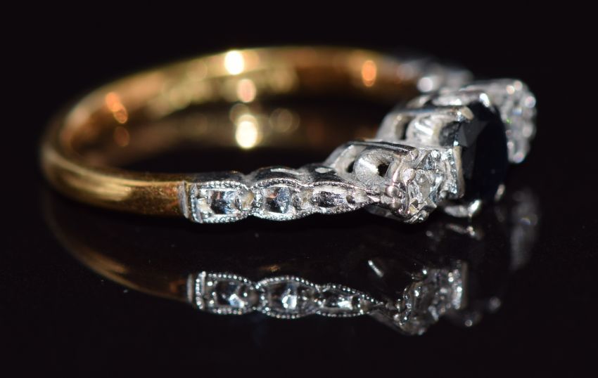 An 18ct gold ring set with a sapphire and diamonds in a platinum setting, 3.5g, size L/M