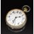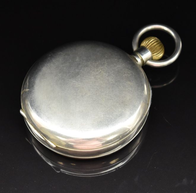 Swiss Goliath style keyless winding open faced pocket watch with inset subsidiary seconds dial blued hands, Arabic numerals, silver plated case and 8 day movement, case diameter 65mm, serial number 33236, in leather easel backed stand.