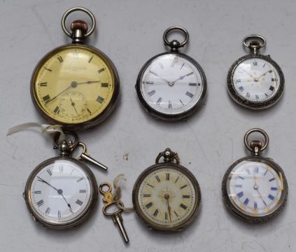 Six silver open faced pocket watches comprising J G Wall & Son of Ross hallmarked silver keyless winding example and five smaller ladies examples, largest case diameter 49mm.