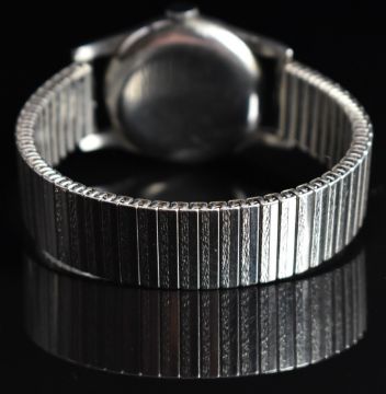 Omega gentleman's wristwatch ref. 10325002 with blued hands, Arabic numerals, silver dial, stainless steel case and signed 16 jewel movement, on expanding metal bracelet, case diameter 33mm, serial number 8503108.