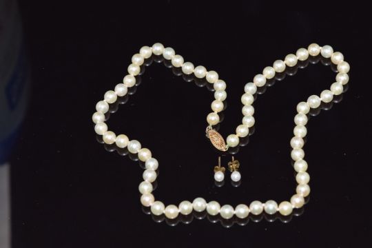 A single stand of cultured pearls with a 9ct gold clasp and a pair of pearl earrings