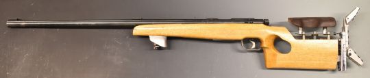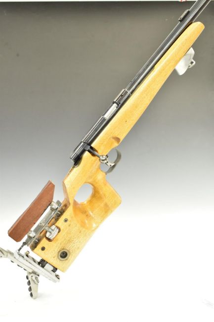 Anschutz model Match 54 .22 bolt-action target rifle with adjustable cheek piece, butt plate and trigger, shaped thumb hole grip and 27 inch barrel, overall length 109cm, serial number 78681.  PLEASE NOTE THAT A VALID RELEVANT FIREARMS/SHOTGUN CERTIFICATE IS REQUIRED TO HANDLE/PURCHASE THIS ITEM.