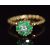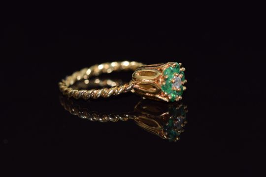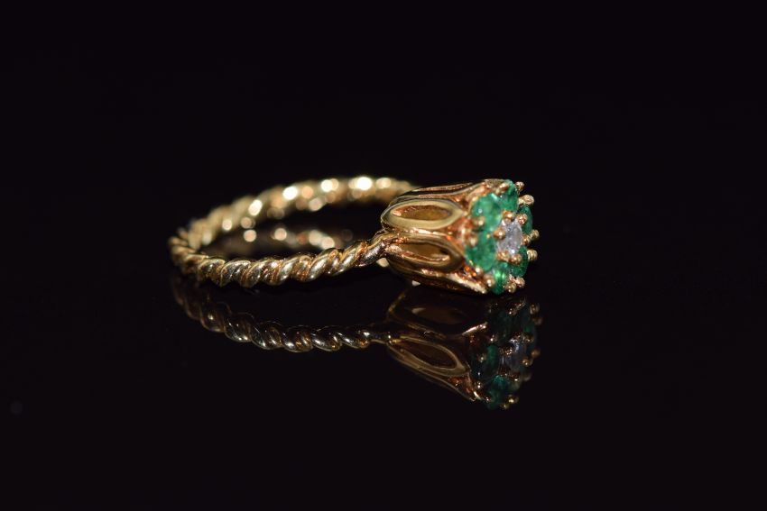 An 18ct gold ring set with a round cut diamond surrounded by emeralds on a rope twist band, 3.6g, size I