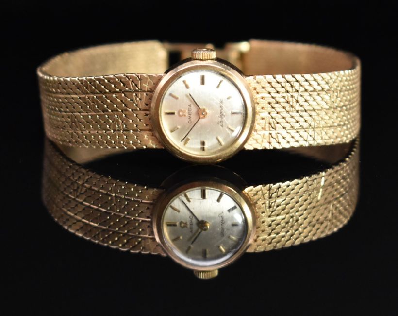 Omega Ladymatic 9ct gold ladies automatic wristwatch with gold hands and hour markers, silver dial and signed 24 jewel calibre 661 movement, on integral 9ct gold bracelet, case diameter 17mm, serial number 7816678, 35g.