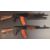 Two airsoft BB guns both in the style of an AK47 machine gun, one with grenade launcher.