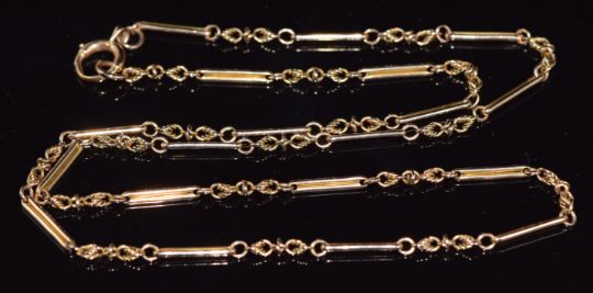 A 9ct gold necklace c1900, made up of knotted and elongated links, 21.2g, 62cm long